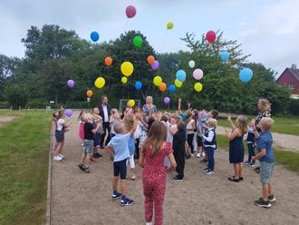 Nun war es aber wirklich Zeit für Bewegung, denn so lange zuhören und stillsitzen ist für die neuen Schüler noch ungewohnt. Frau Senst, die Klassenlehrerin der 2. Klasse, hatte eine besondere Überraschung vorbereitet. Gemeinsam mit den Zweitklässlern durfte auch jedes neue Kind einen mit Helium gefüllten Luftballon hinten auf dem Schulhof in den Himmel steigen lassen. Danach nahm Frau Quaschning ihre ABC-Schützen in Empfang und sie konnten ihre erste „Schulstunde“ im Klassenraum erleben.