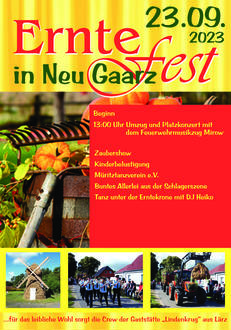 Am 23. September ist es wieder soweit, die Gemeinde Lärz feiert ihr Erntefest. Diesmal ist der Ortsteil Neu-Gaarz Gastgeber für das Fest. Im Bereich der alten Gutsanlage wird wieder einiges los sein und viele Besucher werden erwartet.