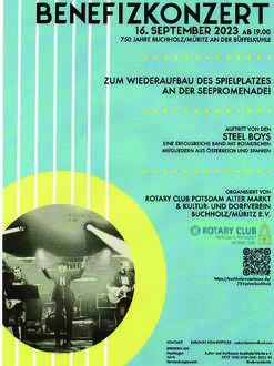 DJ Höppie wird von 15:00 bis 24:00 Uhr für die passende Unterhaltung sorgen. Das Team der Büffelkuhle kümmert sich mit seinen Speisen und Getränken darum, dass alle Buchholzer und Gäste kulinarisch gut versorgt werden. Gegen 16:30 Uhr wird der Trekkerkorso zurückerwartet und die zum Teil historischen Traktoren können bestaunt werden. Parallel laufen die Vorbereitungen für den Auftritt der Band „STEELBOYS“. Diese sechs Musiker aus Österreich und Spanien bestreiten Konzerte (mit Rock, Blues und Pop-Musik aus den 50-er Jahren bis heute), die einen wohltätigen Zweck für ROTARY International haben. Daher haben sie es sich nicht nehmen lassen, den weiten Weg an die Müritz auf sich zu nehmen, als sie davon gehört haben, dass der Spielplatz am Buchholzer Strand einer Auffrischung bedarf, um mit ihrem Auftritt ihren Teil dazu beizutragen. Konzertbeginn ist um 19:00 Uhr! Der Kultur- und Dorfverein Buchholz/Müritz e.V. und der Rotary Club freuen sich über jede Spende, die helfen wird, den Spielplatz am Müritzufer schöner zu machen.