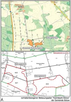 Der Bereich, für den der vorhabenbezogene Bebauungsplan „Hybridpark Bütow“ gelten soll, ist im beiliegenden Lageplan durch eine gestrichelte Linie umgrenzt und umfasst in der Gemarkung Bütow, Flur 3, Teile der Flurstücke 26, 27, 40/2, 45/3 und 45/7.