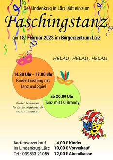 Nachdem die Beschränkungen durch Corona gefallen sind, ist es auch wieder möglich, Veranstaltungen zu planen. So möchte die Gaststätte „Lindenkrug“ am 18. Februar einen Faschingstanz im Saal des Bürgerzentrums veranstalten. Am Nachmittag findet dann auch ein Kinderfasching statt. Karten hierzu sind in der Gaststätte „Lindenkrug“ erhältlich.