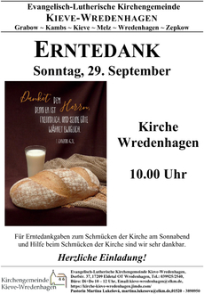 | So. | 29.09. | 10:00 | Erntedankgottesdienst mit Abendmahl; Wredenhagen |