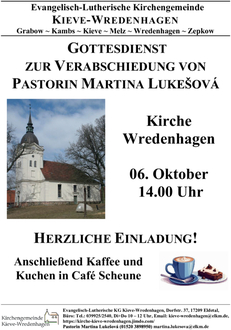 | So. | 06.10. | 14:00 | Gottesdienst zur Verabschiedung von Pastorin M. Lukešová; Wredenhagen |