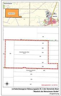 Die Gemeindevertretung der Gemeinde Stuer hat in der Sitzung am 19.09.2024 den Planentwurf des vorhabenbezogenen Bebauungsplans Nr. 04 „Westlich der Warschauer Straße“ in der Fassung vom August 2024 beschlossen.