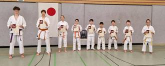 Krönender Abschluss des Lehrgangs war nach einer weiteren Trainingseinheit am Sonntag die Prüfung von neun Schülern, welche alle bestanden und ihren neuen Obi (= Gürtel) präsentieren durften. Auch vom Müritz-Dojo Röbel konnten sich vier Teilnehmer über ihre bestandene Prüfung freuen.