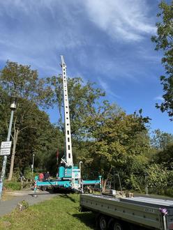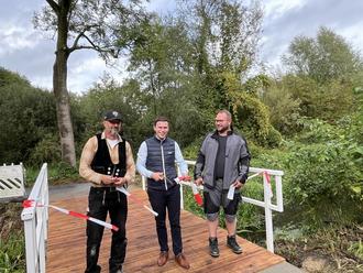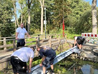 Dass „zwischenzeitlich“ in diesem Zusammenhang ein Jahr bedeutet hat, liegt größtenteils daran, dass für die neue knapp zwei Tonnen schwere Stahl-Holz-Konstruktion ein Kran benötigt wurde, der sich auf dem aufgeweichten Boden rund um die Brücke witterungsbedingt schlichtweg nicht aufstellen ließ. Die Idee dieser Bauweise liegt darin begründet, dass wir doch recht überrascht vom desolaten Zustand der alten Eichenholzbrücke nach der verhältnismäßig geringen Zeit waren. In gemeinsamer Abstimmung von Bauamt und den ausführenden Firmen sind wie daher zu dem Entschluss gekommen, eine Konstruktion aus Stahl und Holz zu verwenden, von der wir uns eine deutlich längere Nutzung erhoffen.