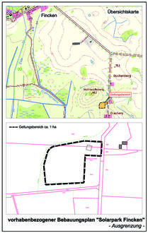 Der Geltungsbereich der Satzung über den vorhabenbezogenen Bebauungsplan Nr. 09 „Solarpark Fincken“ der Gemeinde Fincken ist im beiliegenden Übersichtsplan dargestellt und durch eine gestrichelte Linie umgrenzt.