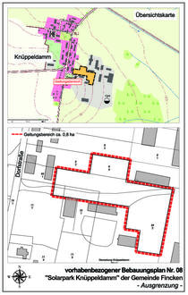 Der Geltungsbereich der Satzung über den vorhabenbezogenen Bebauungsplan Nr. 08 „Solarpark Knüppeldamm“ der Gemeinde Fincken ist im beiliegenden Übersichtsplan dargestellt und durch eine gestrichelte Linie umgrenzt.