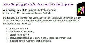 | Fr. | 14.11. | 17:00 | Martinsandacht und Feuer auf der Pfarrwiese; Massow |
