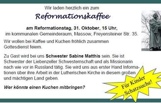 | Fr. | 31.10. | 15:00 | Reformationskaffee und Schatzsuche für Schulkinder; Massow, komm. Gemeinderaum |