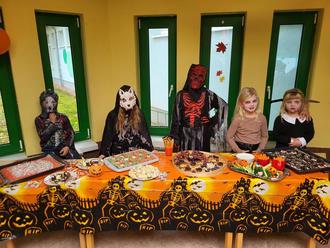 Die Kinder konnten sich schminken lassen, Tattoos aufkleben und an verschiedenen Stationen wie beispielsweise „Wackelaugenwettkampf“ oder „Geisterstopptanz“ teilnehmen. Besonders erfreulich war die Vielzahl an tollen Halloween-Kostümen, die die Kinder trugen sowie die leckeren Gruselsnacks, die für alle Kinder als Buffet bereitstanden. Hier nochmal ein großes Dankeschön an die Eltern, die uns für die Party mit den Leckereien unterstützt haben. Es war für alle Beteiligten eine schöne Halloween-Party.