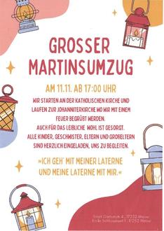 | Mo. | 11.11. | 17:00 | Laternenumzug zum Martinstag; Start an der kath. Kirche Mirow |