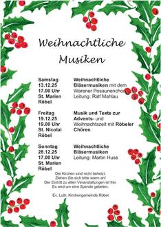 | Fr. | 19.12. | 19:00 | Chorkonzert der Röbeler Chöre; St. Nicolai |