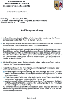 | 1. | Im Freiwilligen Landtausch „Röbel V" wird hiermit die Ausführung des Tauschplanes angeordnet (§ 103f Abs. 3 S. 2 und 3 FlurbG). | |