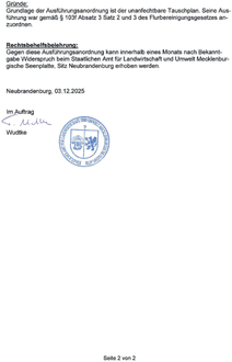 Gegen diese Ausführungsanordnung kann innerhalb eines Monats nach Bekanntgabe Widerspruch beim Staatlichen Amt für Landwirtschaft und Umwelt Mecklenburgische Seenplatte, Sitz Neubrandenburg erhoben werden.