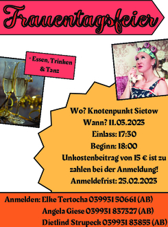 Auch eine Frauentagsfeier soll es in diesem Jahr wieder geben. Organisiert durch die Mitglieder des Kultur- und Sozialausschusses unserer Gemeindevertretung und weitere freiwilliger Helfer soll diese am Samstag, 11.03., in der Gaststätte „Taun Knorrnpunkt“ stattfinden. Eine konkrete Einladung dazu finden Sie ebenfalls im Amtsblatt „Müritz Anzeiger“ oder auf unserer Homepage www.sietowwandelweg.info. Die Veranstalter hoffen auf eine gute Beteiligung; ich wünsche allen Teilnehmerinnen schon jetzt einen vergnüglichen Abend.