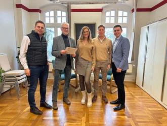 Übergabe Vertrag - Außenstelle Landhausperle - am 05.01.2024 - v. l. n. r.: Herr Strübing (Standesbeamter), Herr Pitann (Amtsvorsteher Amt Röbel-Müritz), Katja und Christian Matyasik (Inhaber Landhausperle), Matthias Radtke (BGM der Stadt Röbel/Müritz)