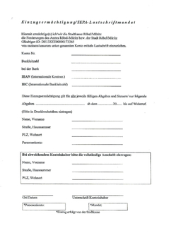 Geben Sie bitte bei allen Zahlungen, Überweisungen oder Nachfragen Ihr vollständiges Personenkonto an. Falls Sie ab diesem Jahr Ihre Steuern und Abgaben abbuchen lassen möchten, finden Sie im Anschluss an diesen Artikel einen Vordruck für eine Einzugsermächtigung, das Formular: SEPA- Lastschriftmandat.