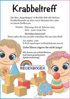 Liebe Eltern, Sie sind jederzeit bei unserem Krabbeltreff willkommen! Haben Sie Interesse und Lust? Dann zögern Sie nicht und rufen uns einfach an: 039823 - 21382 oder schreiben Sie eine E-Mail an: regenbogen-rechlin@diakonie-mse.de. Bis bald. Wir freuen uns auf Sie!