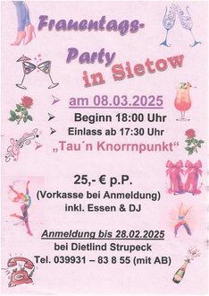 Als nächste Veranstaltung steht die traditionelle Frauentagsfeier – dieses Jahr direkt am Internationalen Frauentag am 08. März 2025 – ins Haus. Einzelheiten dazu können Sie aus dem Plakat im heutigen „Müritz-Anzeiger“ entnehmen. Die Gemeindevertretung würde sich freuen, wenn die Veranstaltung wieder so rege besucht wird, wie in den Vorjahren.