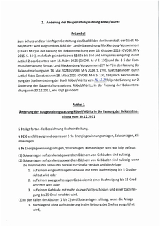Zum Schutz und zur künftigen Gestaltung des Stadtbildes der Innenstadt der Stadt Röbel/Müritz wird aufgrund des § 86 der Landesbauordnung Mecklenburg-Vorpommern (LBauO M-V) in der Fassung der Bekanntmachung vom 15. Oktober 2015 (GVOBl. M-V 2015, S. 344), mehrfach geändert sowie §§ 65a bis 65d und Anlage neu eingefügt durch Artikel 2 des Gesetzes vom 18. März 2025 (GVOBl. M-V S. 130) und des § 5 der Kommunalverfassung für das Land Mecklenburg-Vorpommern (KV M-V) in der Fassung der Bekanntmachung vom 16. Mai 2024 (GVOBl. M-V 2024, S. 270), zuletzt geändert durch Artikel 4 des Gesetzes vom 18. März 2025 (GVOBl. M-V S. 130, 136) nach Beschlussfassung der Stadtvertretung der Stadt Röbel/Müritz vom 16.12.2025 folgende Satzung zur 2. Änderung der Baugestaltungssatzung Röbel/Müritz, in der Fassung der Bekanntmachung vom 30.12.2011, wie folgt geändert: