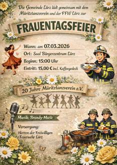 Am 7. März lädt die Gemeinde Lärz zu einer Frauentagsveranstaltung in das Bürgerzentrum Lärz ab 15.00 Uhr ein.