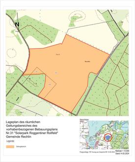 Die Gemeindevertretung der Gemeinde Rechlin hat am 18.12.2025 in öffentlicher Sitzung den Vorentwurf der Satzung über den vorhabenbezogenen Bebauungsplan Nr. 31 „Solarpark Roggentiner Rollfeld“ (Geltungsbereich siehe Übersichtsplan) gebilligt und die Durchführung der frühzeitigen Beteiligung der Öffentlichkeit gem. § 3 Abs. 1 Baugesetzbuch (BauGB) beschlossen.