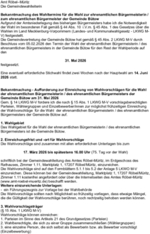 Gem. § 14 LKWG M-V fordere ich die nach § 15 Abs. 1 LKWG M-V vorschlagsberechtigten Parteien, Wählergruppen und Einzelbewerber/innen zur möglichst frühzeitigen Einreichung der Wahlvorschläge für die Wahl der ehrenamtlichen Bürgermeisterin / des ehrenamtlichen Bürgermeisters der Gemeinde Bütow auf.