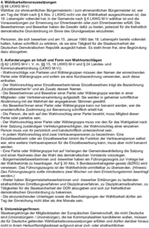 Staatsangehörige der Mitgliedstaaten der Europäischen Gemeinschaft, die nicht Deutsche sind (Unionsbürgerin / Unionsbürger), die bei Kommunalwahlen kandidieren wollen, müssen die für Deutsche geltenden Wählbarkeitsvoraussetzungen erfüllen und dürfen darüber hinaus nicht in ihrem Herkunftsmitgliedstaat aufgrund einer zivil- oder strafrechtlichen Einzelfallentscheidung von der Wählbarkeit ausgeschlossen sein. Sie haben ihrer Zustimmungserklärung (Formblatt 4.1.3 oder 5.1.3 LKWO M-V) oder ihrem Wahlvorschlag als Einzelbewerbung (Formblatt 4.2 oder 5.2 LKWO M-V) eine Versicherung an Eides statt über ihre Wählbarkeit im Herkunftsstaat beizufügen (Formblatt der Anlage 6 LKWO M-V).