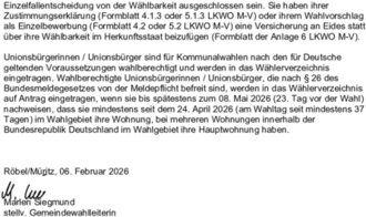 Unionsbürgerinnen / Unionsbürger sind für Kommunalwahlen nach den für Deutsche geltenden Voraussetzungen wahlberechtigt und werden in das Wählerverzeichnis eingetragen. Wahlberechtigte Unionsbürgerinnen / Unionsbürger, die nach § 26 des Bundesmeldegesetzes von der Meldepflicht befreit sind, werden in das Wählerverzeichnis auf Antrag eingetragen, wenn sie bis spätestens zum 08. Mai 2026 (23. Tag vor der Wahl) nachweisen, dass sie mindestens seit dem 24. April 2026 (am Wahltag seit mindestens 37 Tagen) im Wahlgebiet ihre Wohnung, bei mehreren Wohnungen innerhalb der Bundesrepublik Deutschland im Wahlgebiet ihre Hauptwohnung haben.