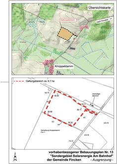 Der Entwurf des vorhabenbezogenen Bebauungsplanes Nr. 13 „Sondergebiet Solarenergie Am Bahnhof“ der Gemeinde Fincken, bestehend aus der Planzeichnung, der Begründung, dem Umweltbericht und der SPA-Verträglichkeitsprüfung ist vom 23.02.2026 bis einschließlich 27.03.2026