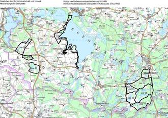 Im Auftrag des Staatlichen Amtes für Landwirtschaft und Umwelt Mecklenburgische Seenplatte (StALU MS) soll eine Kartierung aller nach § 20 Naturschutzausführungsgesetz Mecklenburg-Vorpommern (NatSchAG M-V) in Verbindung mit § 30 Bundesnaturschutzgesetz (BNatSchG) geschützten Biotope (beide zusammen im Folgenden: geschützte Biotope) und die Erfassung und Bewertung von Lebensraumtypen nach Anhang I der FFH-Richtlinie (im Folgenden: LRT) durchgeführt werden. Die Kartiergebiete sind in nachfolgender Karte verzeichnet.