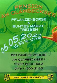 Auf der Buchholzer Seite des Glambecksees findet im Rahmen der Veranstaltungsreihe zum 750-jährigem Dorfjubiläum von Buchholz die Pflanzenbörse mit buntem Markttreiben statt. Es werden Pflanzen aller Art, Saaten, Rosengewächse, Keramik, Töpferei, Honigprodukte, Holz- und Naturdeko angeboten. Eine Kräuter-Fee wird vor Ort sein und eine Schnapsbrennerei. Weiterhin wird es einen Boots- und SUP-Verleih geben. Wer Interesse an Gartentipps und Infomaterial von „Natur im Garten“ sowie Hobbykunst-Bildern hat, wird sie hier finden. Für das leibliche Wohl ist mit Kaffee, Kuchen, Getränken und Imbiss gesorgt.