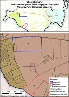 Der Bereich, für den der vorhabenbezogene Bebauungsplan „Solarpark Vipperow“ gelten soll, ist in beiliegendem Lageplan durch eine gestrichelte Linie umgrenzt und umfasst 2 Teilgeltungsbereiche. Teilgeltungsbereich 1 befindet sich westlich der Ortschaft Vipperow und grenzt südlich an die B 198. Teilgeltungsbereich 2 befindet sich südwestlich der Ortschaft Vipperow und südlich von Teilgeltungsbereich 1. Teilgeltungsbereich 1 umfasst in der Gemarkung Vipperow, Flur 5, die Flurstücke 1 und 2/1. Teilgeltungsbereich 2 umfasst in der Gemarkung Vipperow, Flur 5, die Teilfläche des Flurstückes 34.