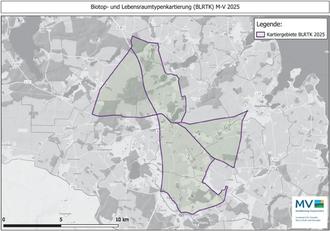 Im Jahr 2025 erfolgen Kartierungen in ausgewählten Bereichen außerhalb von FFH-Gebieten. Hierbei werden auch die nach Anhang I der Richtlinie 92/43/EWG (FFH-Richtlinie) geschützten Lebens-raumtypen (LRT) erfasst und bewertet. Die Lebensraumtypen bestehen weitestgehend aus gesetzlich geschützten Biotopen. Weitere Informationen zu geschützten Biotopen und FFH-Lebensraumtypen in M-V erhalten Sie auf der Homepage des LUNG: