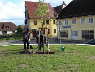 Nach Rücksprache mit unserer Baumverantwortlichen, Frau Blümel, soll dieser Baum nicht der einzige auf der Fläche an der Kirche bleiben. Freuen wir uns also schon darauf, dass unsere Stadt grüner wird.