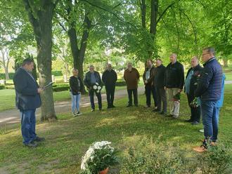 Zur Kranzniederlegung am 08.05.2024 trafen sich der Stadtpräsident, der Bürgermeister, Pastor Herrmann sowie einige Stadtvertreter, Amtsleiter und Bürger zur Kranzniederlegung am Gedenkstein der Opfer von Krieg und Gewaltherrschaft auf dem Stavenhagener Friedhof.