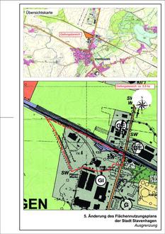 Die Stadtvertretung der Stadt Stavenhagen hat in öffentlicher Sitzung am 14.09.2023 für den in anliegender Übersichtskarte gekennzeichneten Änderungsbereich die Aufstellung der 5. Änderung des Flächennutzungsplans der Stadt Stavenhagen beschlossen. Der Beschluss der Aufstellung des Bebauungsplans wurde gemäß § 2 Abs. 1 BauGB am 2. Dezember 2023 im Reuterstädter Amtsblatt Nr. 24 bekannt gemacht.