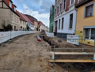 Nach Aufnahme der Oberflächen wurden umfangreiche Suchschachtungen durchgeführt, um die neue Fernwärmeleitung der Wärmeversorgung Stavenhagen GmbH in den Bauraum einordnen zu können. Die Gehwege sind mit Rohrleitungen und Kabeln voll belegt. Unterhalb der Fahrbahn ist Platz für die Fernwärmetrasse, jedoch kreuzen Leitungen diverser Medien in verschiedenen Höhenlagen den Rohrgraben. Umverlegungen sind so bei einer Gasleitung und bei Trinkwasserhausanschlüssen nötig geworden. Schwierigkeiten bereitet auch das anhaltende Regenwetter. Eine offene Wasserhaltung mittels Pumpe wird eingesetzt um die Schweiß- und Isolierarbeiten an den Fernwärmerohren zu ermöglichen.