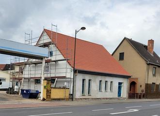 31.07.2023 Fritz-Reuter-Straße 8 – Das Dach wurde mit naturroten Bibern eingedeckt, neue Fenster und die Hauseingangstür sind eingebaut, die Fassade wird derzeit verputzt.
