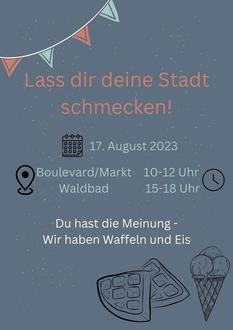 Von 10:00 bis 12:00 Uhr werden wir eure Anregungen gegen Waffeln auf dem Boulevard/ Markt und von 15:00 bis 18:00 Uhr gegen Eis im Waldbad tauschen. Bring Dich ein! Es ist deine Stadt der Zukunft!