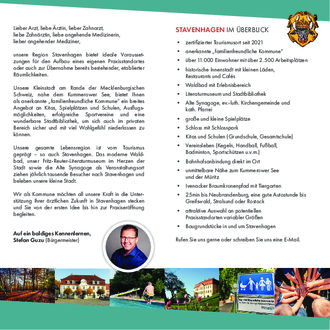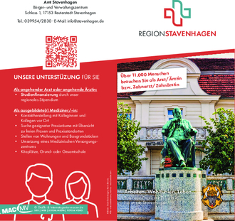 Passend zu diesem Thema wies er auf den immer gravierender werdenden Ärztemangel in unserer Region hin und machte auf den, in Zusammenarbeit mit RUN entwickelten Flyer aufmerksam, der Informationen zu Förder- und Unterstützungsmöglichkeiten angehender Ärzte für den Amtsbereich Stavenhagen enthält.