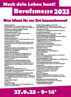 Am 27.09.2023 in der Zeit von 9.00 - 14.00 Uhr fand in der Sporthalle (Str. des Friedens) die Berufsmesse 2023 der Reuterstadt Stavenhagen statt. In seiner Begrüßungsrede dankte unser Bürgermeister, Stefan Guzu, den über 34 angereisten Unternehmen und wünschte ihnen viel Erfolg bei der Nachwuchsgewinnung.