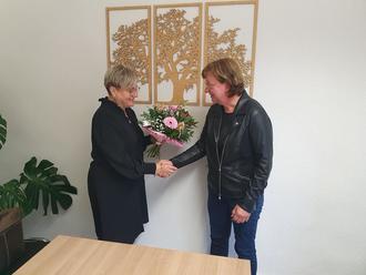 Frau Vonthien (2. Stadträtin) überreicht Blumen an Frau Hohenegger (Mitarbeiterin Bauamt)