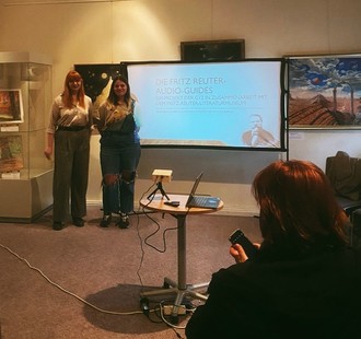 Nach wochenlanger Vorbereitung und Erarbeitung übergaben am Freitag, dem 22. März, Lea Wiegert und Hannah Kauer aus der Klasse G12 im Namen ihres Jahrgangs die Reuter-Audioguides feierlich an das Literaturmuseum. Die Aufgabe der Schülerinnen und Schüler bestand im Rahmen des Deutschunterrichts darin, ihre Verbindung zu Fritz Reuter zu erkunden, indem sie fünf „Reuterstätten“ näher betrachten. Viele Orte in unserer Stadt Stavenhagen, die im Leben und im Werk von Fritz Reuter relevant waren, sind auch für die Jugendlichen heute noch von Bedeutung. Diese persönliche Bezüge wurden dialogisch beschrieben und von den Schülerinnen und Schülern vertont. Entstanden sind sechs Tonspuren, die sich z.B. mit dem Schloss, dem alten Rathaus oder der Köster-Schaul beschäftigen und ab Mai zusätzlich zu dem informativen Audio-Teil für alle Besucherinnen und Besucher unserer Stadt zur Verfügung stehen werden. Jeder, der sich dann mit den Audioguides des Museums auf Tour durch die Reuterstadt begibt, kann neben den historischen Fakten auch hören, was Fritz Reuter für die jungen Menschen bedeutet, die hier aufwachsen. „Für uns als Abiturienten, die Stavenhagen nun vielleicht bald verlassen, ist es schön, auf diese Weise unserer Schule und unserer Stadt etwas hinterlassen zu können“, sagt Lea Wiegert aus der Klasse G12. Hannah Kauer dankte dem Museum: „Das war eine tolle Chance für uns, uns kreativ und eigenständig mit Fritz Reuter zu beschäftigen.“ Wir danken außerdem Herrn Zeisler von der Kulturschule Malchin für die professionelle Unterstützung bei den Tonaufnahmen.