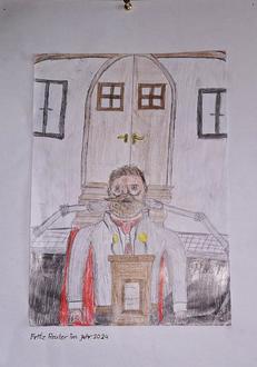 Einige besuchten im Vorfeld extra das Literaturmuseum, um sozusagen hautnah Recherche zu betreiben, aber auch um Ideen und auch Material zu sammeln. Bis zum letzten Tag wurde an der Umsetzung gearbeitet. In der Woche vor den Osterferien war es dann soweit, die Jury begutachtete die Reuter-Räume. Museumspädagogin Frau Rühle, Kunstlehrerin Frau Dr. Nikelski und Koordinatorin Frau Rockenschuh-Ofcsarik bewerteten unter anderem den Bezug zu Reuter und zum Niederdeutschen, die Gesamtgestaltung und die Kreativität bei der Umsetzung. Vor allem bei Letzterer wussten die Kinder zu überraschen. Immer wieder mussten die Jury-Mitglieder schmunzeln, wenn sie entdeckten, was den Mädchen und Jungen so alles eingefallen war. „De Kinners ut Stemhagen un von Land“ haben eindrucksvoll bewiesen, dass Reuter auch heute noch präsent ist. Ein eigens erstellter Stundenplan, Begrüßungsplakate mit dem Spruch „ Gauden Dach! Hier is mine Heimat, dor bün ik to hus!“, Reuter als Pop Art Motiv, uns Fritzing im Jahr 2024 – die Kreativität kannte keine Grenzen.