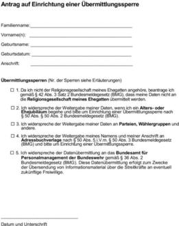 Bei einem Widerspruch werden die Daten nicht übermittelt. Der Widerspruch ist bei der Meldebehörde der alleinigen Wohnung oder der Hauptwohnung einzulegen. Er gilt bis zu seinem Widerruf.
