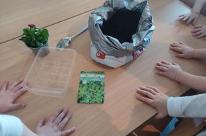 Anschließend haben die Kinder den Müll sortiert und ordnungsgemäß entsorgt. Aus einigen Plastikverpackungen bastelten die Kinder Blumentöpfe und pflanzten dort Blumen und Kresse ein und stellten sie im Gruppenraum auf ihre Tische.