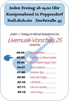 im Rahmen unserer ehrenamtlich getragenen Kneipenklubabende (jeden Freitag, ab 19.00 Uhr im Stall.dich.ein in 18184 Poppendorf, Dorfstraße 43) gibt es nur für euch jeden 1. Freitag im Monat Livemusik - Eintritt frei.