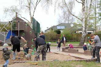 Eine Herausforderung stellte das Bodentrampolin dar. Dies hatte sich über die Jahre mit Sand und Laub gefüllt, so dass die Kinder nicht mehr hüpfen konnten. Mit tatkräftiger Unterstützung vieler Väter wurde es ausgegraben und gereinigt. So steht dem Spaß nichts mehr im Wege. Auch der Gruppenraum der „Käfer“ bekam einen frischen Anstrich und glänzt nun in neuen Farben.